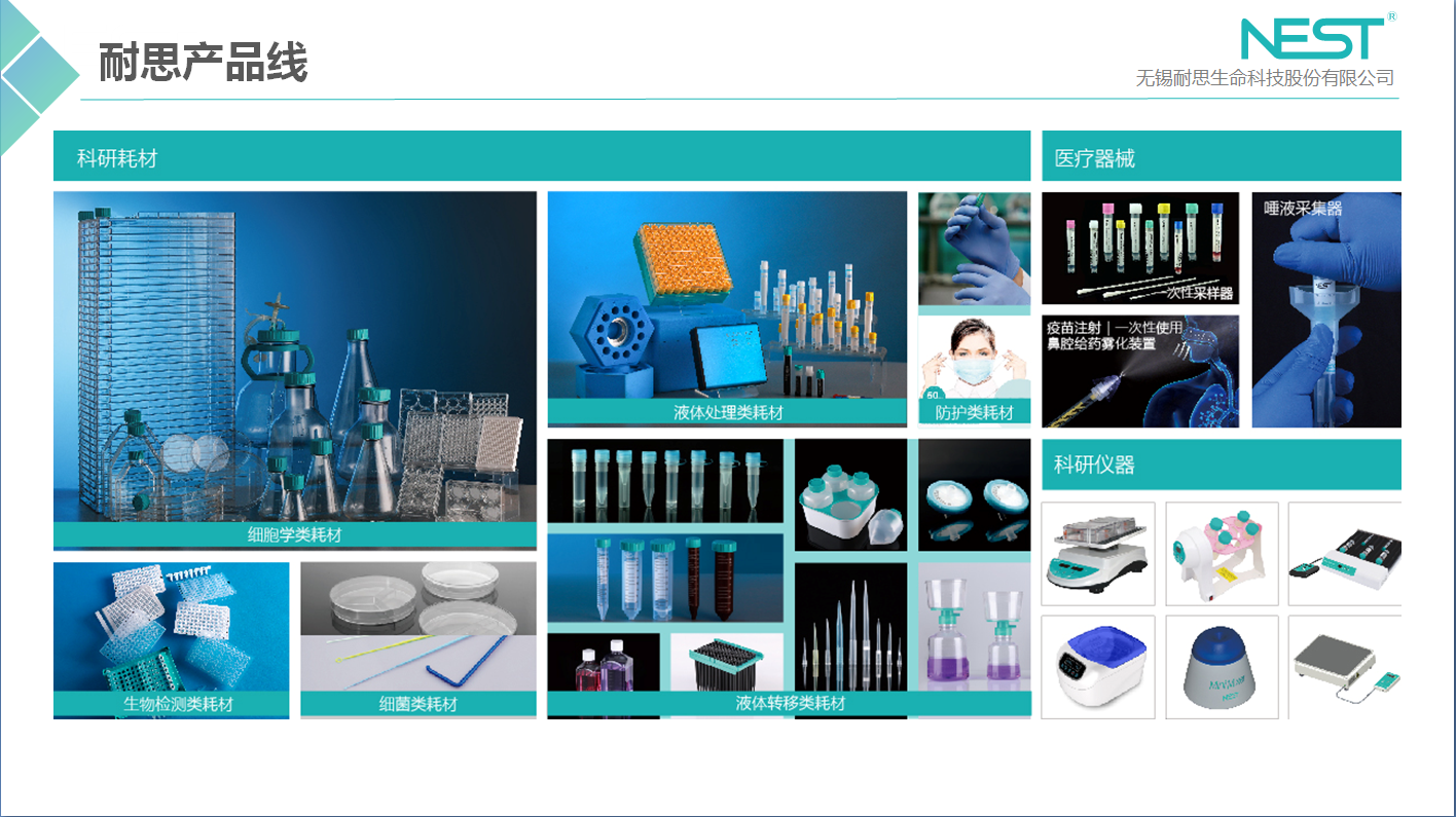 耐思NEST品牌主要產(chǎn)品分為:科研耗材、醫(yī)療器械和體外診斷三大類。耗材類根據(jù)應(yīng)用領(lǐng)域不同,可細分為六大類:細胞類耗材、液體處理類耗材、液體轉(zhuǎn)移類耗材、生物檢測類耗材、細菌類耗材、防護類耗材。
