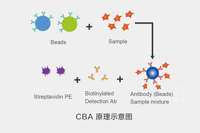 包被細(xì)胞因子特異性抗體的熒光磁性微球與待測樣本孵育,可與樣本中相應(yīng)的細(xì)胞因子特異性結(jié)合,加入生物素標(biāo)記的檢測抗體后,形成抗體包被微球-細(xì)胞因子-檢測抗體的免疫復(fù)合物;最后加入SAV-PE,通過流式細(xì)胞儀檢測,熒光強(qiáng)度與樣本中細(xì)胞因子的含量成正比,最后結(jié)合細(xì)胞因子標(biāo)準(zhǔn)品的標(biāo)準(zhǔn)曲線,從而實(shí)現(xiàn)對同一份樣本中細(xì)胞因子的定量檢測。